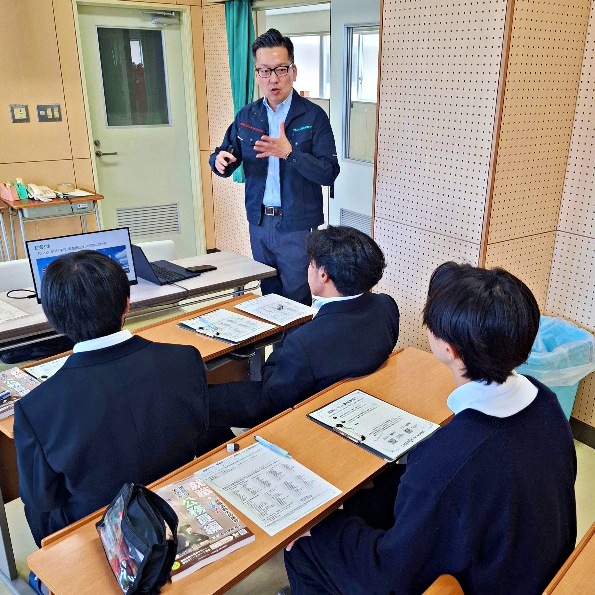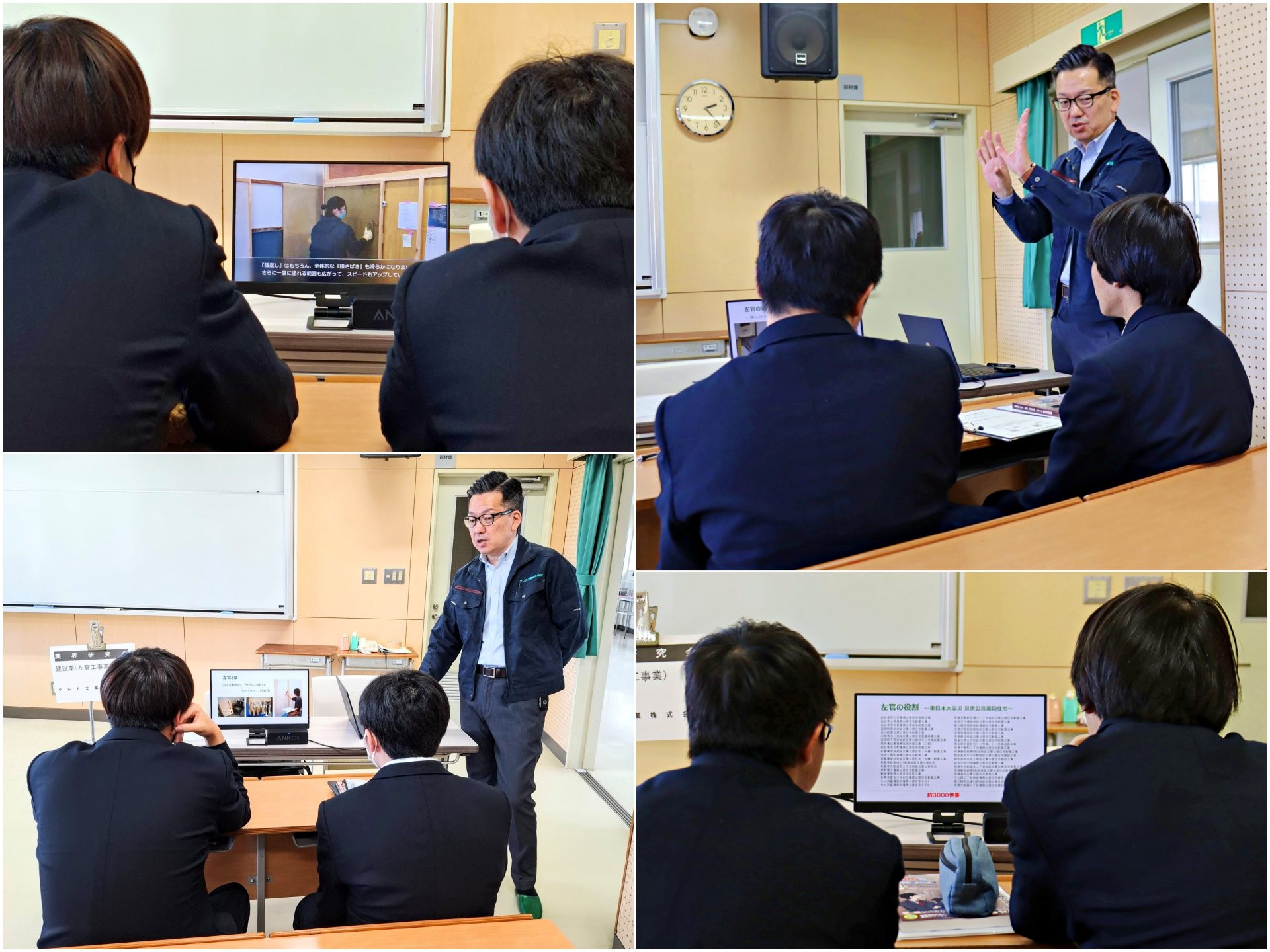 さらに、学校のある石巻市内に建てられているいくつもの復興公営住宅の左官工事にも、クレア工業の左官職人たちが携わっていることを知ると、身を乗り出して説明中の画面に食い入る生徒も。左官業が、当社のキャッチコピー『街を創り、暮らしをまもる』を“地で行く仕事”であることを理解してくれたようでした。