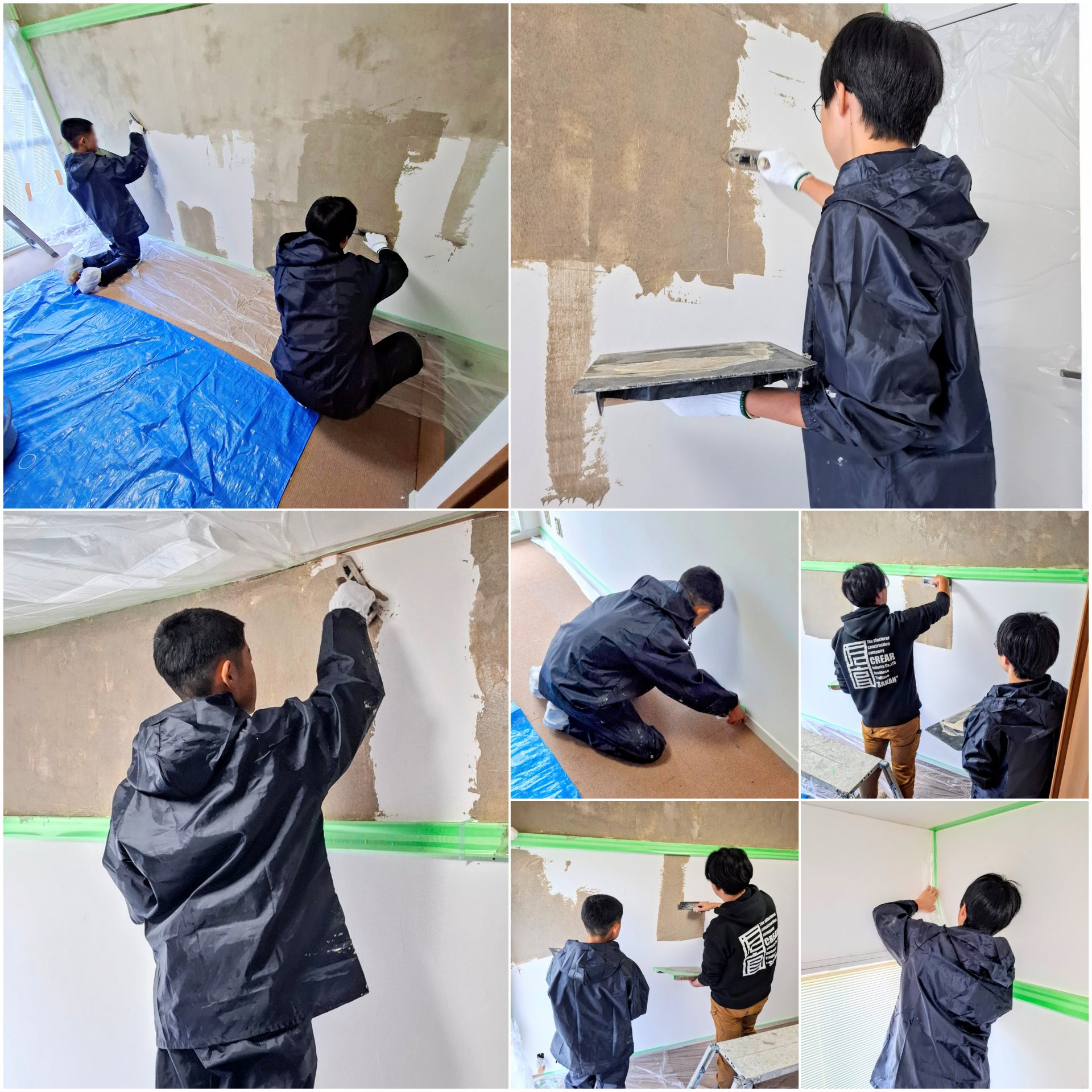 最終日は体験学習の総ざらいとして、部屋の壁を塗っていきます。材料がついて汚れたり、傷ついたりするのを防ぐための養生(ようじょう)作業も、自分たちで実施!そして生徒たちの鏝さばきも、初日と比べると非常にスムーズで、確かな成長が見て取れました。最終的に壁一面を塗り上げて、見事に目標を達成しました!