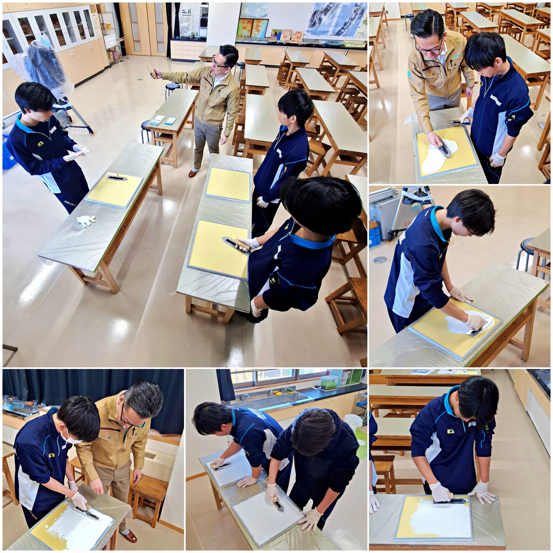 この日は、通常の『左官業の説明』に加えて、簡易版の『塗り壁体験』をプラスした“スペシャルバージョン”!弊社社長から鏝の使い方に関してレクチャーを受けて、コンパクトサイズのボードに「漆喰(しっくい)」を塗っていきます。